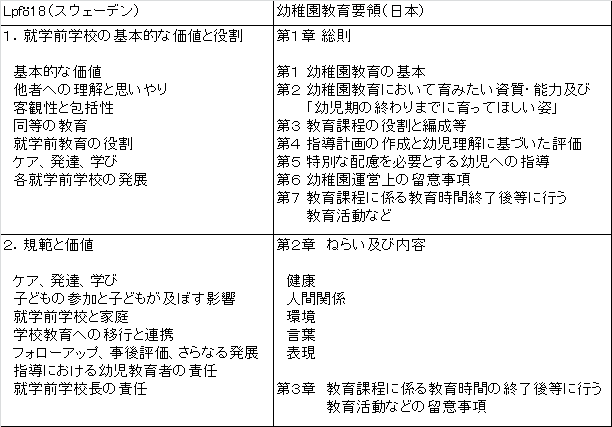 スウェーデンでは子どもや保護者のニーズに合わせて多様な幼児教育が提供されているが、どれも国定カリキュラム(Lpfö18)に準拠して行われている。日本では、幼稚園、保育所、認定こども園それぞれに幼児教育カリキュラムがある。本稿は幼児‘教育’に重点を置いて論じたので、教育を主目的としている幼稚園のカリキュラムである幼稚園教育要領を比較に用いた。