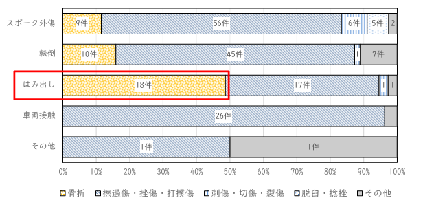 2019年からの5年間で207件の自転車の後部に子どもを乗せていて起きた事故が報告されており、そのうちスポーク外傷が最多の約4割、脚などのはみ出しによるケガは2割です。スポーク外傷では擦り傷や捻挫が多いのですが、アキレス腱が切れたり、皮膚が大きく裂けてしまったりして縫合や植皮が必要になった事例もあります。はみ出しによるケガは骨折などの重傷が多く、大腿骨骨折のような治療にも回復にも長い時間がかかる深刻な状態になる危険が高いです(参考資料3、図3)。